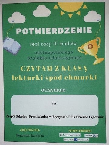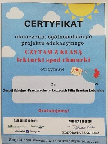 Klasa 2a ukończyła ogólnopolski projekt edukacyjny "Czytam z klasą lekturki spod chmurki" Pracowaliśmy przez 9 miesięcy realizując kolejne zadania z trzech modułów projektu. Nie powstrzymała nas epidemia. Ostatnie zadania realizowaliśmy, każdy w swoim domu. Gratuluję wszystkim swoim uczniom.