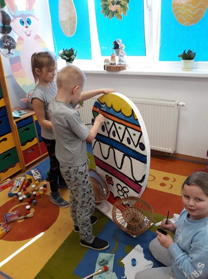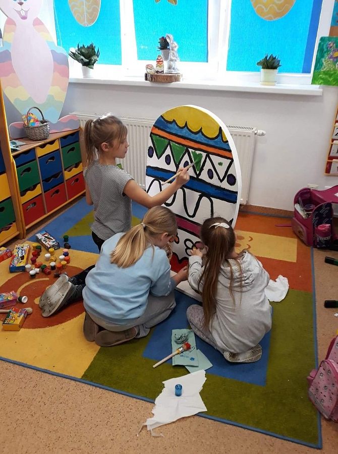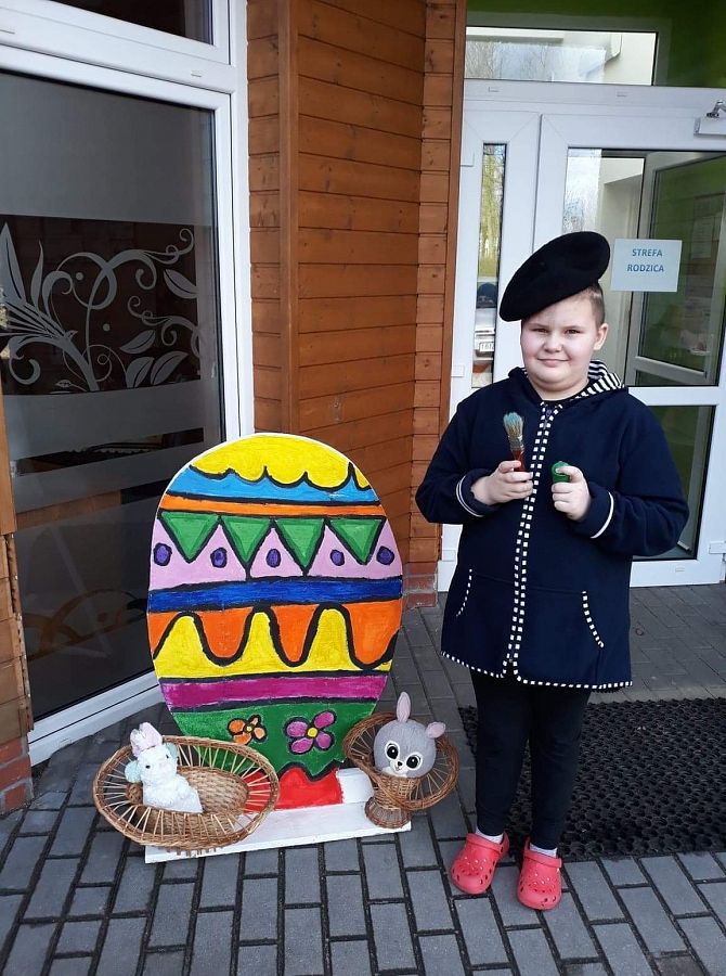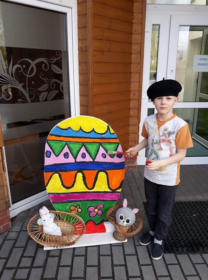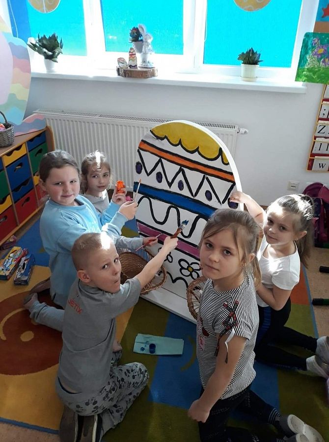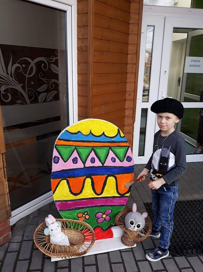 Wszyscy już czujemy atmosferę Świąt Wielkanocnych. Czekamy na zajączka, malujemy jajka. Postanowiliśmy też coś zrobić. Poprosiliśmy Pana Romka,aby wyciął nam duże jajko ze sklejki. Na zajęciach koła plastycznego pomalowaliśmy je. Nasze wymalowane jajko postawiliśmy przed głównym wejściem do szkoły. A to są efekty naszej pracy.