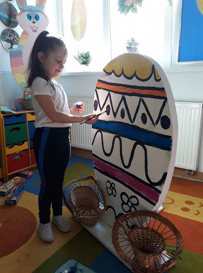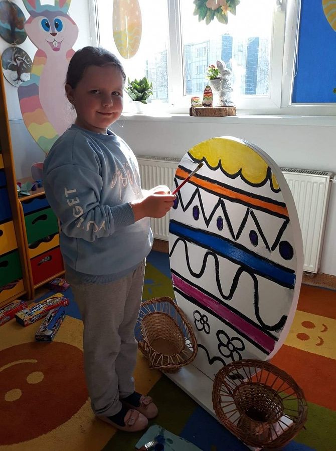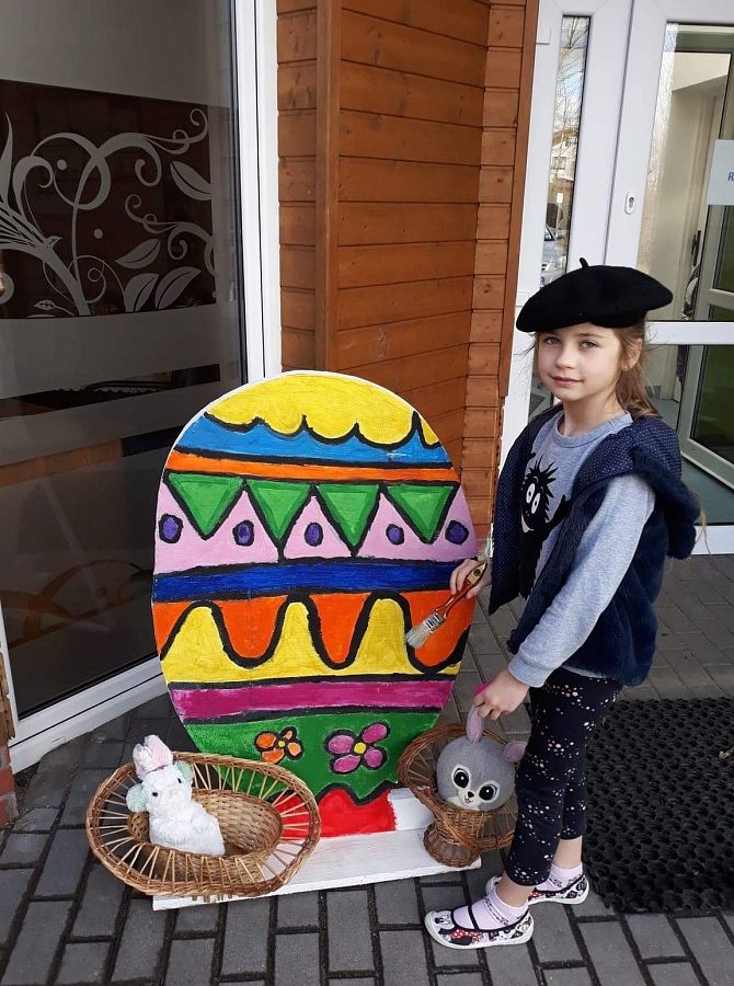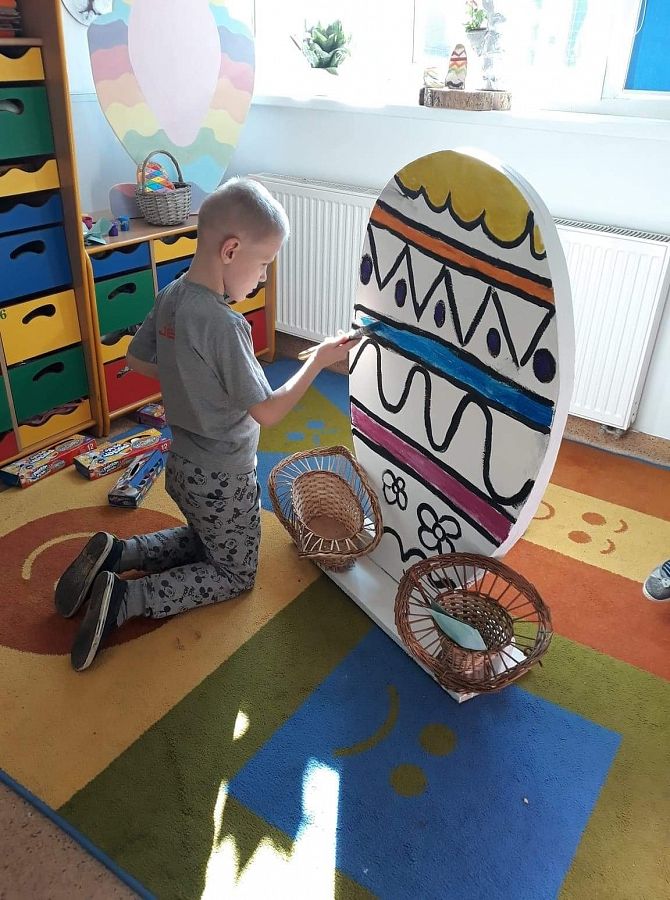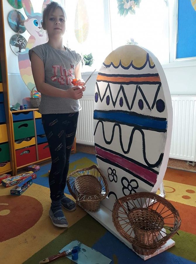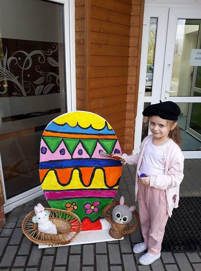 Wszyscy już czujemy atmosferę Świąt Wielkanocnych. Czekamy na zajączka, malujemy jajka. Postanowiliśmy też coś zrobić. Poprosiliśmy Pana Romka,aby wyciął nam duże jajko ze sklejki. Na zajęciach koła plastycznego pomalowaliśmy je. Nasze wymalowane jajko postawiliśmy przed głównym wejściem do szkoły. A to są efekty naszej pracy.