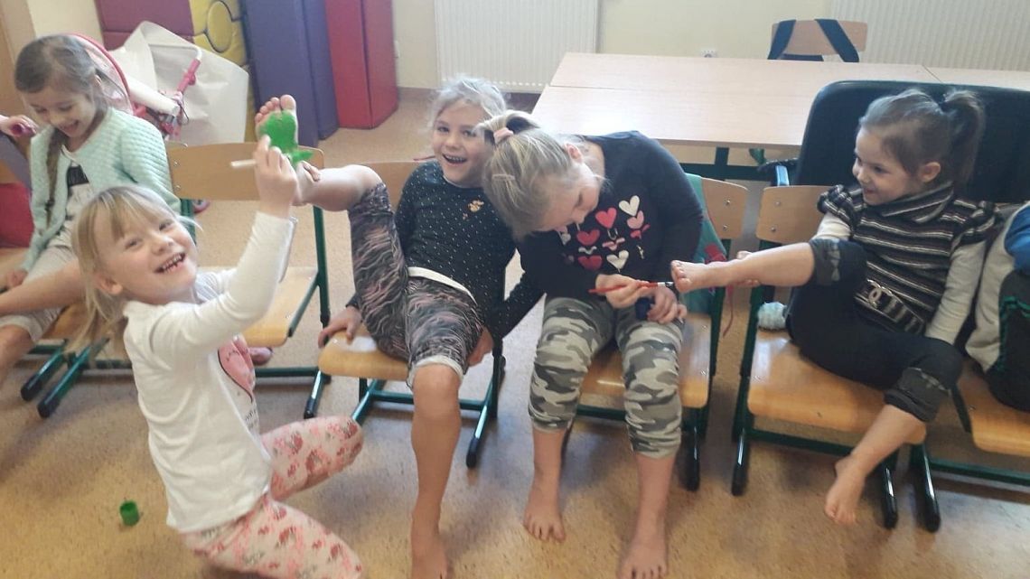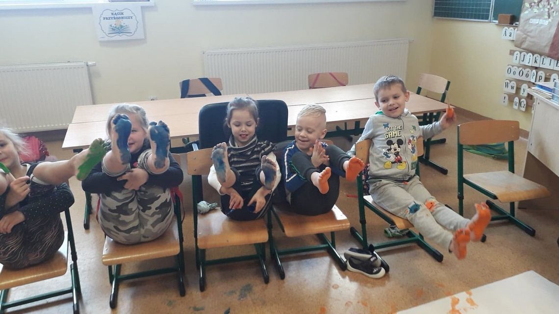 Maluchy z zerówki wspaniale łączą zabawę z nauką . Postanowiliśmy wymyślić zabawę ruchową ...grę , którą dzieci nazwały STOPKI. Najpierw malowały stopy, a później odbijały je na długim papierze w różnych kierunkach. Gdy odbicia wyschły i ścieżka dziecięcych stópek była gotowa , zadaniem było w jak najkrótszym czasie pokonać dystans ustawiając własne stopy w sposób , które wskazywały rysunki. Zabawa była świetna, ale najwięcej radości i śmiechu przysporzyło dzieciakom wspólne malowanie stóp.
