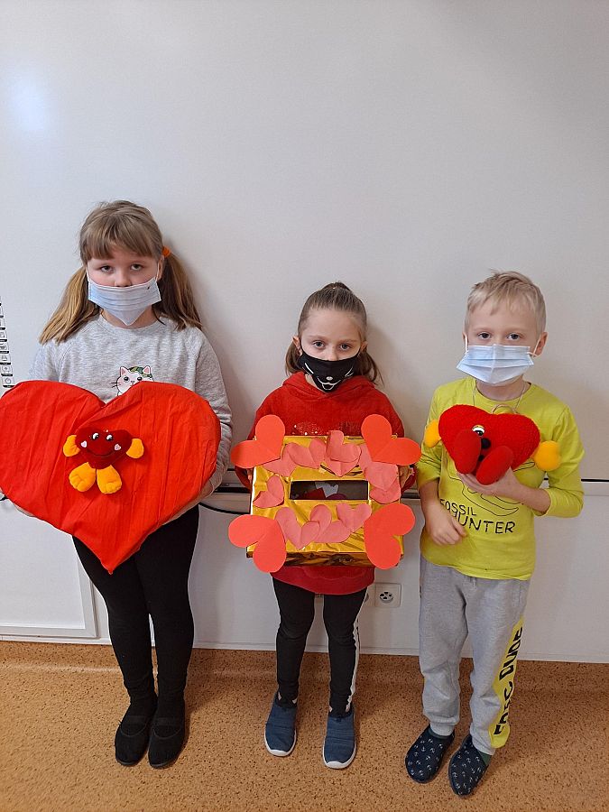 W ostatni dzień przed feriami zimowymi uczniowie klasy 2c zamienili się w kurierów walentynkowych. Każdy uczeń i przedszkolak otrzymał Walentynkę. Przez tydzień można było wrzucać do specjalnie przygotowanej skrzynki walentynki...To miłe, że możemy okazywać sobie sympatię i przyjaźń w sympatyczny sposób.